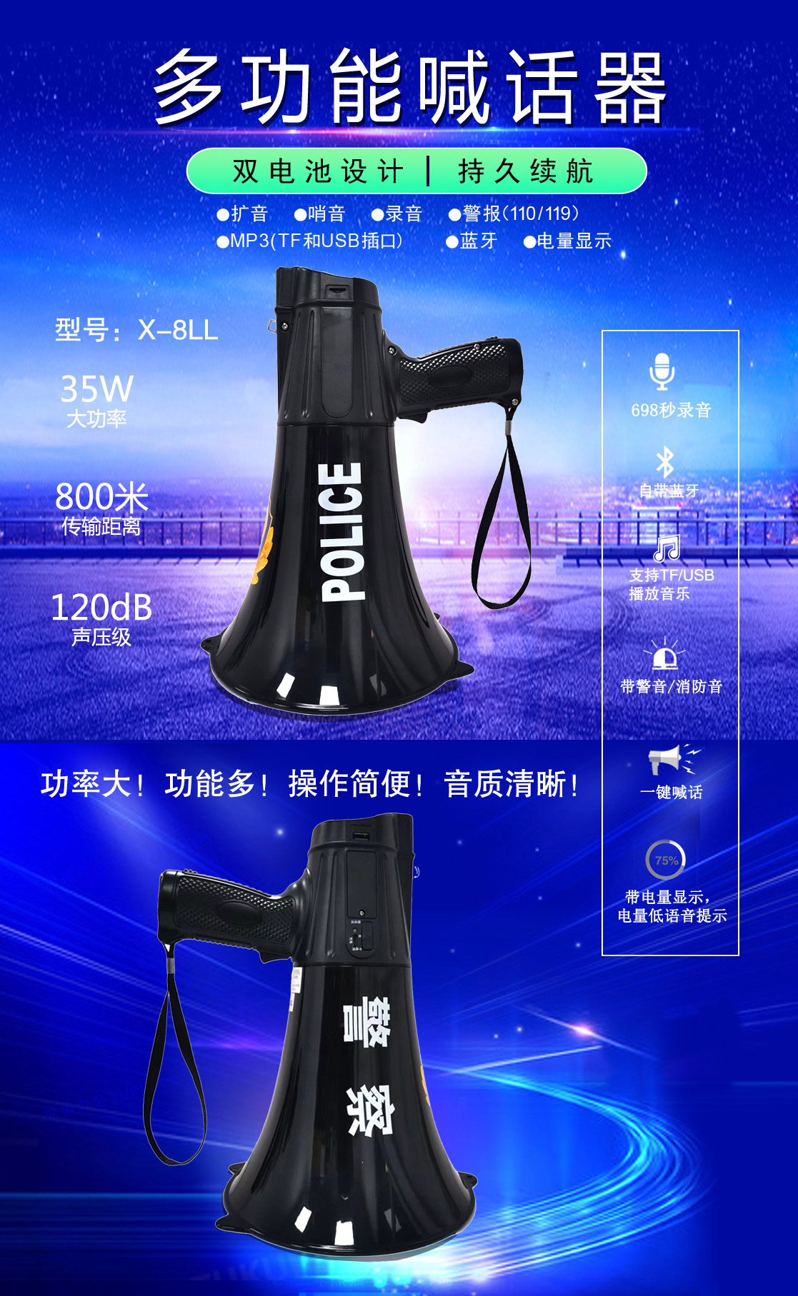 • 專業(yè)設(shè)計(jì),外觀獨(dú)特、新穎,操作簡便的多功能喊話器